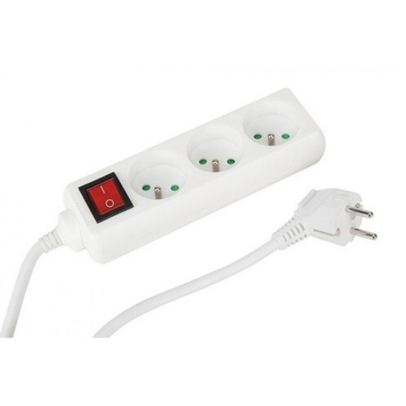 Bloco de tomadas triplo com 3 entradas Schuko, cabo de 3 metros e sem interruptor, ideal para uso doméstico, escritório ou informática. Estrutura resistente e segura.