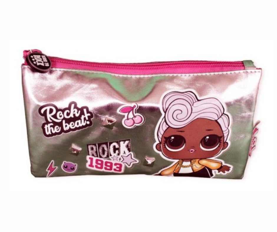 Estojo escolar com design moderno da linha LOL Surprise Born to Rock, na cor prata metalizado. Ideal para armazenar e organizar lápis, canetas, borracha e outros itens de papelaria.