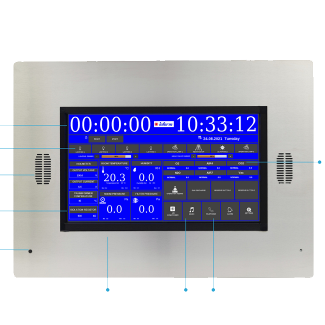 Os painéis de controle da sala cirúrgica são usados para controlar a iluminação, lâmpadas de operação, negatoscópios, etc., e para exibir informações ambientais, como temperatura, umidade, pressão do filtro e pressão diferencial da sala, com sensores externos a serem conectados. Possui muitos recursos adicionais, como comunicação com o painel de gás e o sistema de automação, telefone viva-voz e sistema de som.