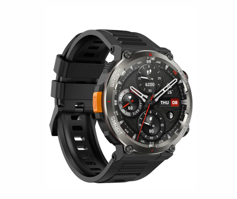 Relógio inteligente resistente com visual robusto, ideal para esportes e atividades corporais. Permite realizar e atender chamadas via Bluetooth, além de contar com display amplo e bateria de longa duração
